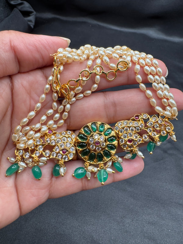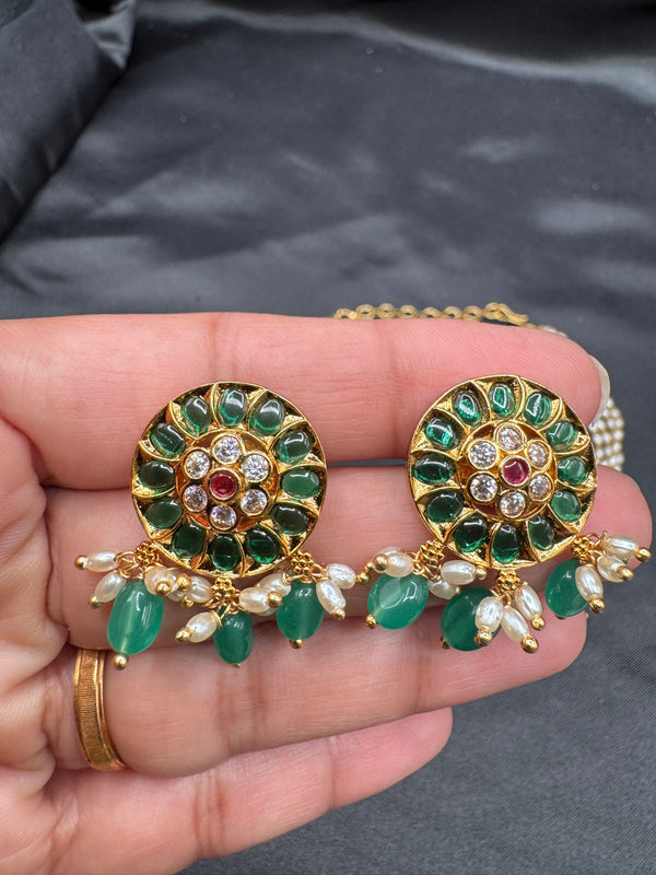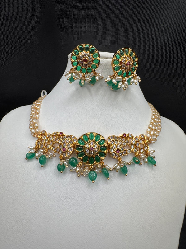 Pearl with CZ stones and emerald pendant & earrings