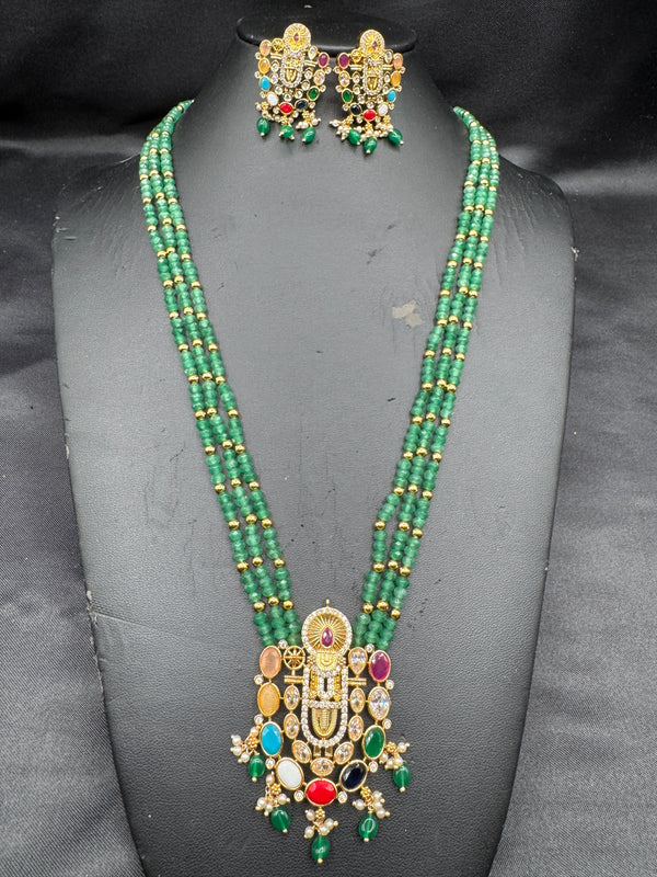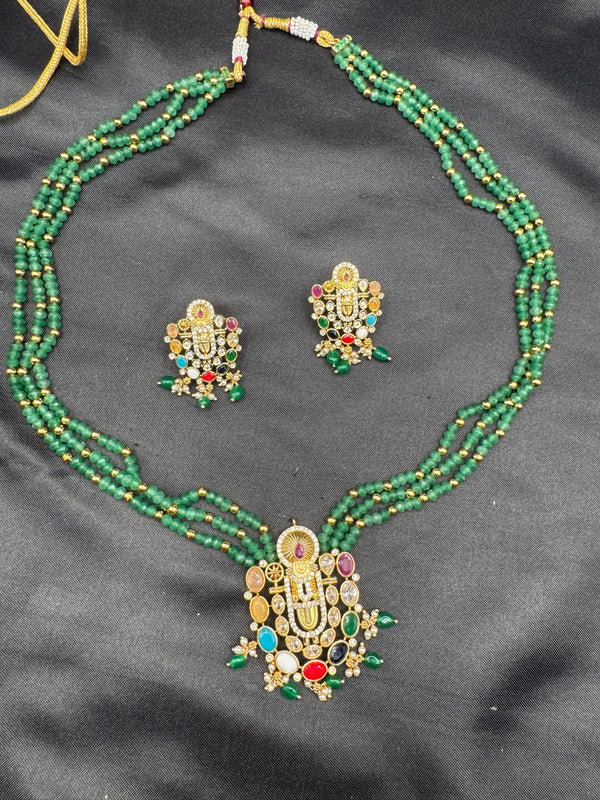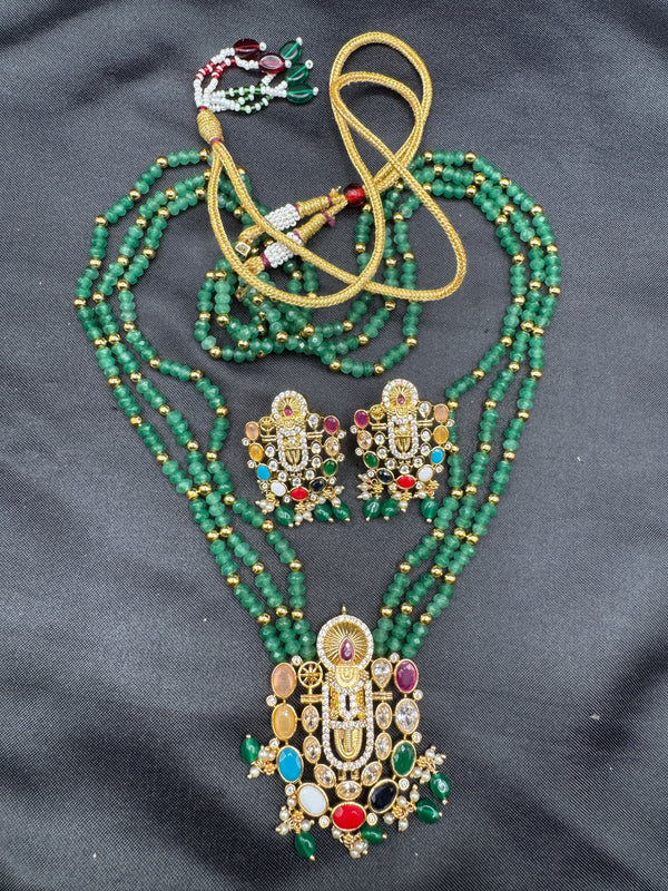 Long three-line Emerald bead chain with Navrathana Stones Venkateshwara Swamy pendant with matching earrings